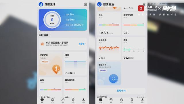 之后便是进入APP首页,APP设计的也很科学,主页包含每日的步数和运动记录,还包含睡眠、血氧饱和度、心脏健康和体温。